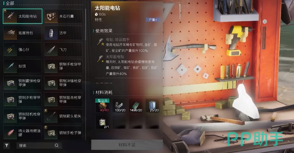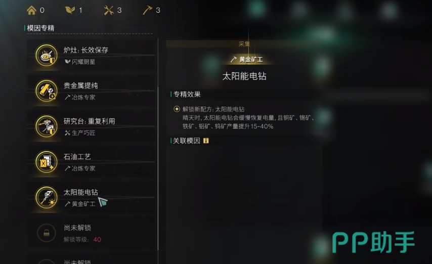 当玩家们来到35级后,就可在模因专精里解锁太阳能电钻了,此后就能在制作台里把太阳能电钻给造出来。制造该道具所需材料除了金矿外,其它都可通过采集或分解来获取,而且获取的难度并不大,若是玩家缺少材料可前往对应的地图来进行收集。要是缺金矿则可前往黑心地带采集,或是与别人进行交换。