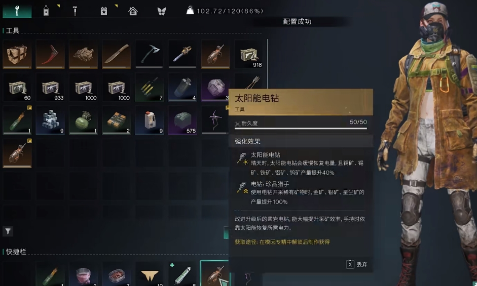 当电钻成功被玩家们制造出来后,只要拉到快捷栏里就能便捷地去使用它了。每次使用它时都会扣除一定的耐久值,但好在太阳能电钻会在晴天缓慢地进行耐久恢复,所以玩家们可多造一个电钻,并在电钻耐久来到个位数时换上新的继续采集,将耐久不足的电钻放好让它缓慢恢复耐久。