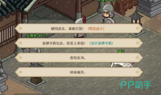 当小伙伴们在完成大理寺风云这一部分的任务时,会与风波亭这个地方产生较大的关联。大理寺位于吴越地区,小伙伴们可以直接来到大理寺的门口,在这里你将会触发三个选项,如果你手中有金牌令箭,或者名声大于等于6的话,都是可以直接进去的。如果以上这两个要求你都没有达到的话,那么就只剩下硬闯这一个方法。这不仅会触发战斗,同时大理寺的好感度也会减100。
