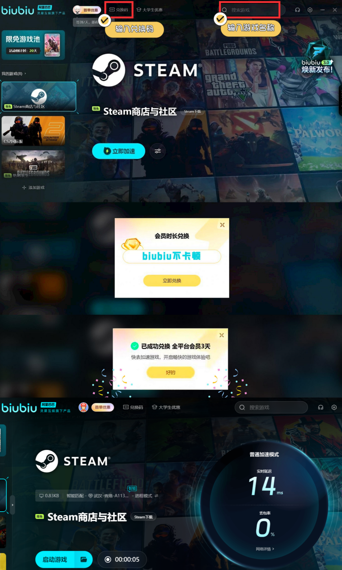 此外想要获取更多加速机会也是可以的,大家可去点击软件首页中的兑换,然后去输入【biubiu不卡顿】,如此就能得到72h的加速时长,关键就在于它是不限新老用户的,作为平台的新用户到时候能拿到96h的加速机会哦。