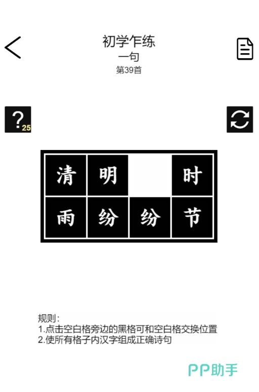 诗词华容道将古诗词融入了华容道玩法中,需要玩家们组合成正确的诗词顺序,进而才能完成过关,使得游戏不光很注重玩家们对诗词的积累,还较为考验玩家们在移动文字时所用的策略,也让游戏有着很不错的玩法乐趣。该作的整体界面有着较为简洁的设计,而且体验起来很是流畅,无论玩家们进行何种操作,都有着非常迅速的响应速度。