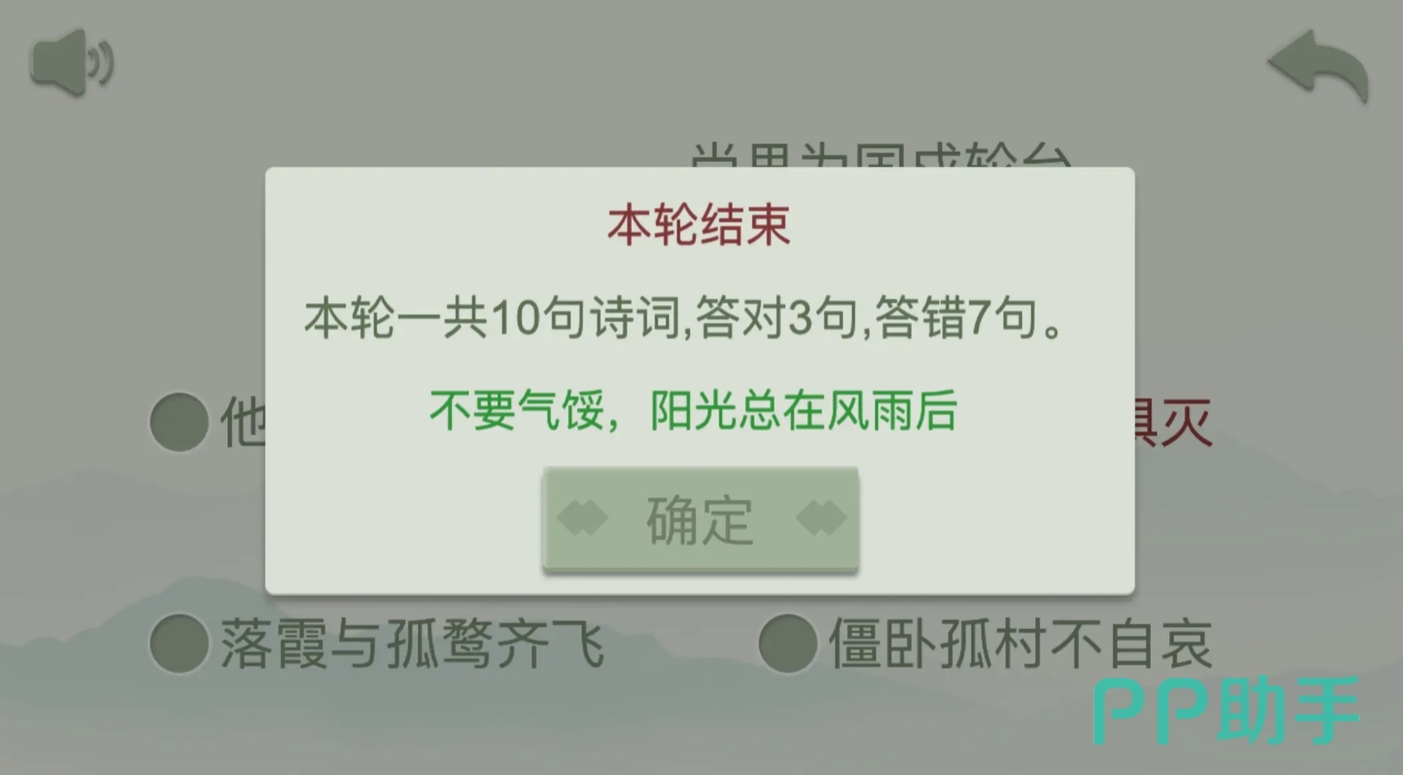 本款作品是玩法十分直观的古诗词问答游戏,每次进入答题后游戏会随机挑选十道题作为玩家们的答卷,需要玩家们将正确地诗词填入空白处,把整句古诗给补充完整,在结束后会放出本次答卷的答题情况,让玩家们对自己的古诗词水平获得一个清晰的认知。当然,若是答错了,游戏还会立刻纠正玩家们的错误,加深玩家们对该诗词的印象。