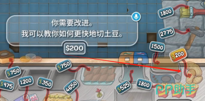 在游戏中如果对切土豆的时间进度条不满意,可以花费200硬币进行升级改进。这个应该是游戏中升级最便宜的一项,所以完全不用犹豫,攒够钱就立刻升级吧!