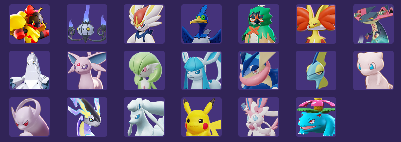 红莲铠骑、水晶灯火灵、闪焰王牌、古月鸟、狙射树枭、妖火红狐、多龙巴鲁托、铝钢龙、太阳伊布、沙奈朵、冰伊布、甲贺忍蛙、千面避役、梦幻、超梦Y、密勒顿、九尾、皮卡丘、仙子伊布、妙蛙花