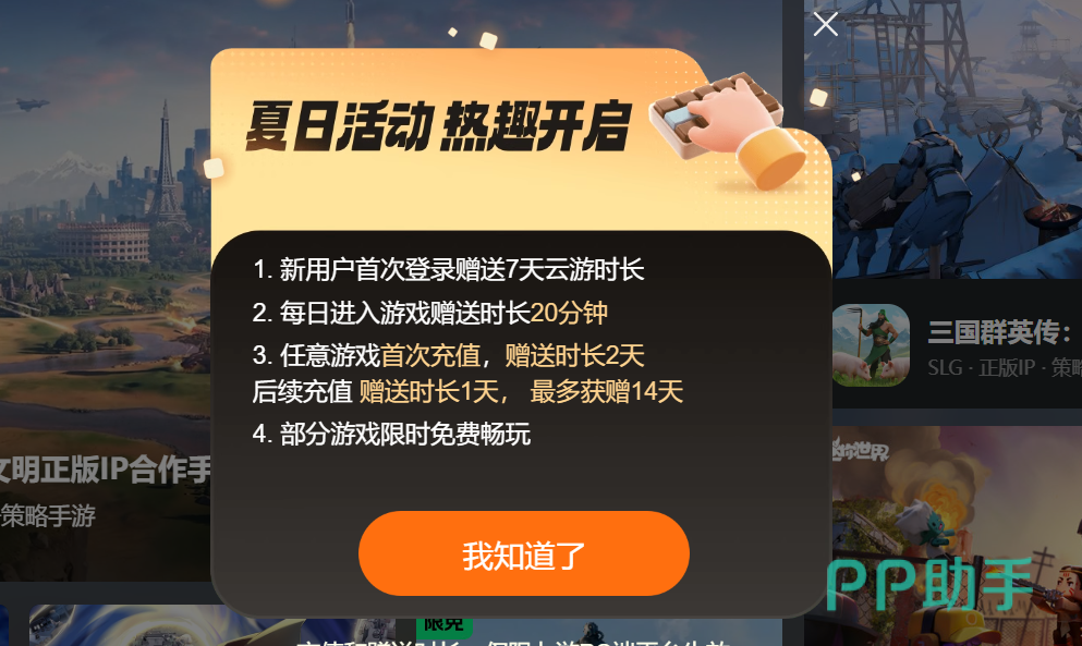 目前九游正在举行一个活动。在活动期间,为首次登录九游云游戏的玩家送出7天免费试用时长。而且游玩时间超过2小时,还会赠送一天畅玩时长,累积可获得七天;每日进入游戏也会赠送时长20分钟,并且任意游戏首次充值,都会赠送2天的时长,本次活动福利多多,不容错过。