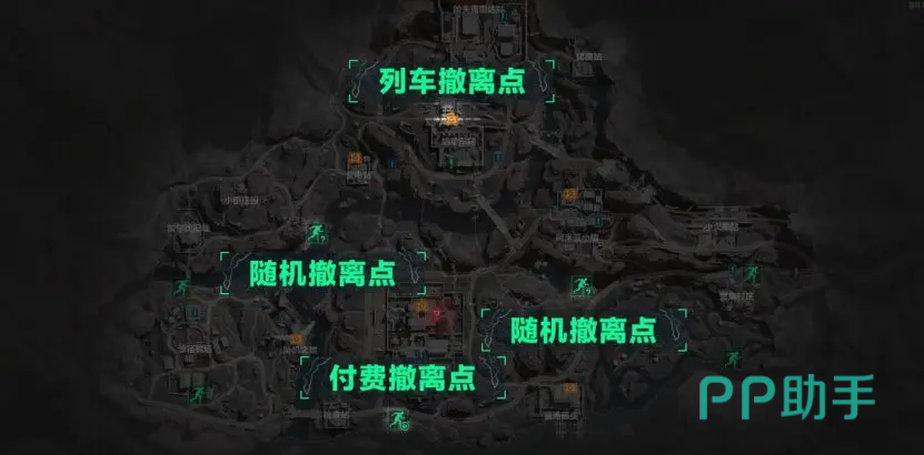 目前这张地图上有八个撤离点,有常规的撤离点,也有满足条件之后才能使用的特殊撤离点。目前有4个常规撤离点,2个概率撤离点,1个付费撤离点,还有1个列车撤离点。不同撤离点的使用方式以及所需满足的条件不同。
