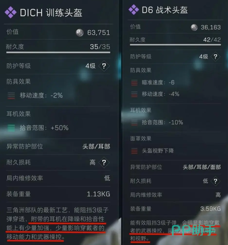 主要是头盔与护甲,护甲分为不同的防护等级,自然是越高对子弹的防护的效果越好。同等级下的护甲也是有不同样式的,有防护面积小耐久低的轻甲,也有防护面积大耐久高的重甲。不过即便是再高级的护甲也防不了所有的部位,例如手臂、腿。头盔可以抵挡致命伤害,而且不同的头盔对于视觉、听觉也是有影响的。战斗中,如果子弹命中没有防护的区域会打出晕眩,进而视觉上也会有影响。在新手阶段主要是看目标危险程度来选不同价格、类型、等级的防具。