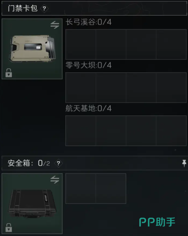 除了常用的装具外,还有几个特殊的装具,例如:门禁卡包、安全箱。门禁卡包是放一些门卡钥匙的,安全箱则是放武器配件之外的物品,这些东西即便撤离失败了也不会损失。所以,当在地图上搜刮到好东西的时候,可以第一时间放到里面去。