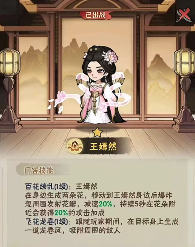 门客定位:门客任盈盈适合过图,她的技能“易伤妖王荒兽”值得考虑。