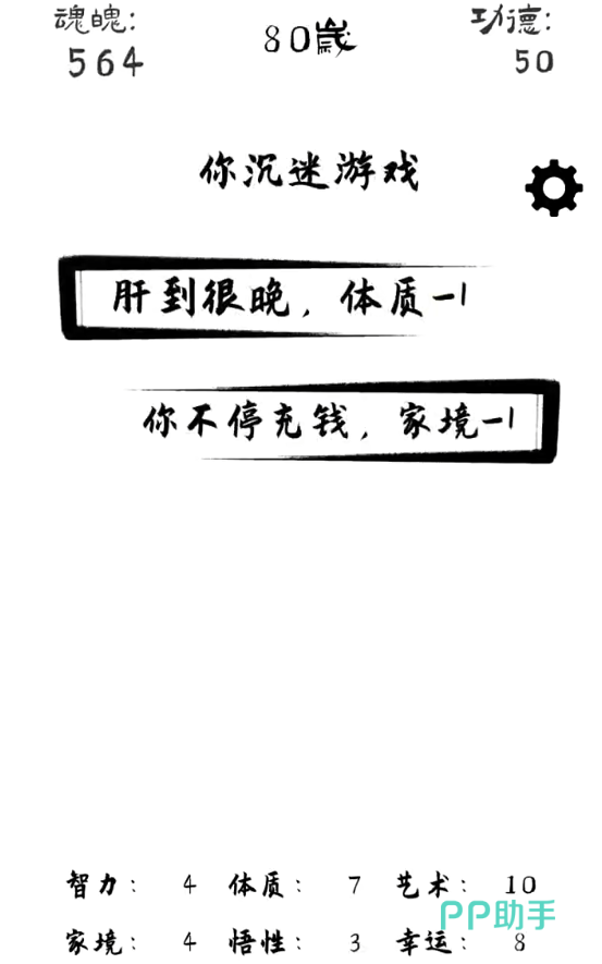 每个玩家在开局的时候还都会拥有投胎点数,自由分配点数到家境、悟性、幸运、艺术、体质和智力中,会有不同的人生选择,比方说幸运高的可以遇到各种奇遇时间,走上创业道路,艺术高的可以当上演员或艺术家,玩家可以在开局时决定不同的路线,并且还能在每一世获得更多的功德,为下一世获得更多的点数,让生活更加轻松。