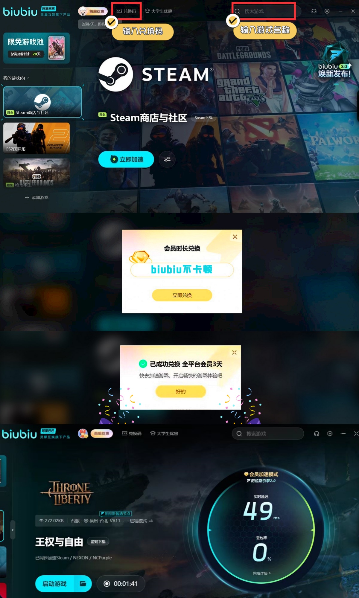 想要获取更多加速时长,玩家可去输入口令【biubiu不卡顿】去兑换72小时的加速,关键就在于所有平台用户皆可领取。