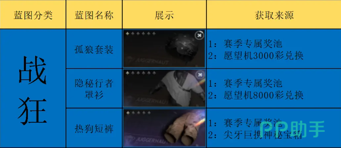 在战狂这个蓝图分类中一共包含了三种装备,第1个孤狼套装,想要获取这套装备的话,目前一共是有两个方法,一个是通过赛季专属奖池抽出来,另外一个是直接前往愿望机通过3000彩就可以兑换到。第2个隐秘行者罩衫,同样是有两个获取方式,并且和孤狼套装差不多,第1个就是在奖池里面抽,第2个就是花费8000彩在愿望机里兑换。第三个热狗短裤,可以在奖池中抽取,也可以在尖牙巨楔神秘宝箱里开出来。