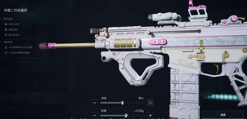 然后就是前握把推荐推荐使用共振二代前握把,这个配件能够增加后坐力控制和操控速度,这两个属性都是SCAR-H所稀缺的,通过使用这个配件,可以更好地控制SCAR-H的后坐力,提高射击的稳定性和准确性,除了以上三个主要的改装点外,还有一些其他的配件也值得考虑,例如瞄准镜可以根据个人喜好和游戏需求进行选择,弹夹方面可以选择扩容弹夹以增加容弹量,枪托则可以选择适合自己的款式以提高舒适度和稳定性。