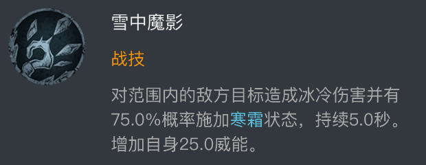 多克拉兹的战技雪中魔影在释放之后会对技能范围内的敌人造成冰冷的伤害,并且有百分之七十五的几率会再次施加一层寒霜的状态持续五秒。这个技能还可以增加多克拉兹自身二十五的威能。