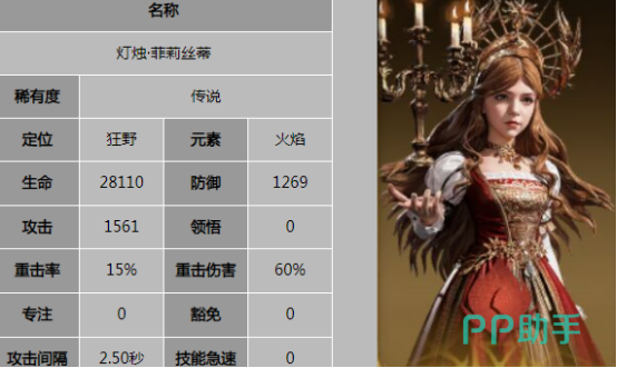 菲莉丝蒂传说级别的狂野角色生命值也很高为28110,可以在整个队伍当中担任队长,无论哪种战斗都能给队友提供30%的重击伤害。被动技能普通攻击和战技触发时能够增加自身5%的威能。大招名字叫做火羽,狂野发射火焰激光,对敌方造成三次伤害,每一次都能增加370%的火焰伤害,另外还能无视目标护盾。