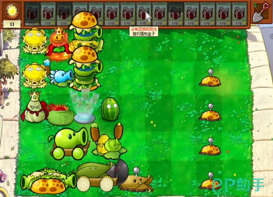 而且一旦获得如玉米毁灭菇或毁灭加农炮等强力攻击植物,我们基本就稳了,但是前期切记当赌狗,一定要确保每排输出跟得上之后再进行抽盲盒,如果前期拿到魅惑大蒜也不错,能够改变僵尸行进路线,也是一种有效的战术,剩下一排资源,缓解一下阳光的压力。总之就是初期应尽量种植成本低但效率高的植物,为后期留出足够的资源部署更强大的防线。