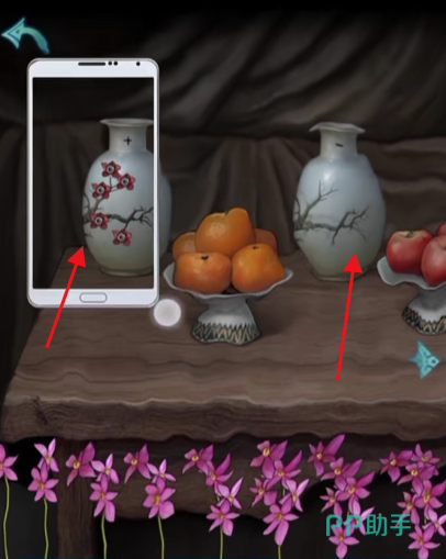 花瓶与明信片的组合,将花放入花瓶,并用相机拍摄以获取每个花瓶应插几朵花的线索。根据花瓶上的加减符号和相机显示的图案数量,正确选择插花数量。完成后,将获得另一张半张【明信片】。将两张明信片拼合,再次使用相机观察,你将获得新的线索。