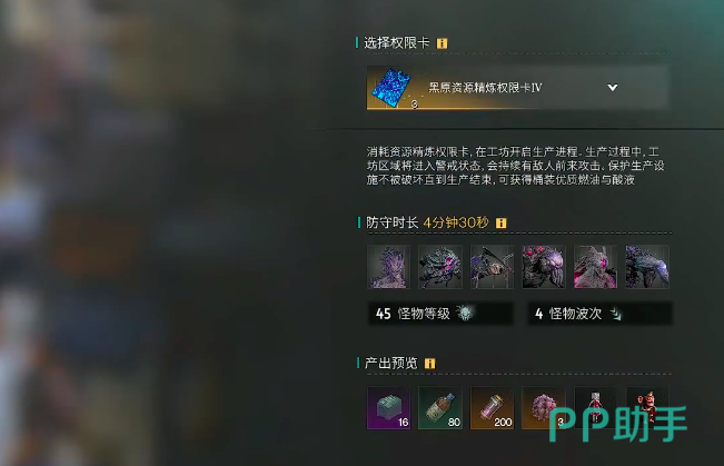在游戏当中要想获得权限卡就需要进入到对应区域,游戏当中需要防守住一波波的怪物,一般每局战斗过程大概持续4分30秒,每次需要刷怪四到五波,玩家可以根据自身的等级情况选择合适的区域进入。难度等级越高,刷出的权限卡概率也就越高。比如黑原的资源精炼全显卡可以帮助玩家快速练出燃油与酸液,但需要提示的是该款精炼权限卡的难度比较高,玩家需要防守住45等级的怪物巢,所以建议达到三周目之后再进行刷卡。