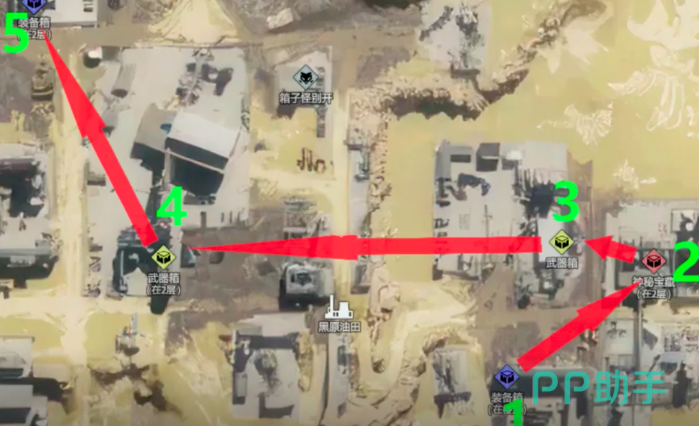 第二种方法就是通过开宝箱这种方式是比较简单的,玩家可以选择不同区域的宝箱进行开启,依旧以黑原油田作为例子。小编在下方标注了五个宝箱,分别是一号装备宝箱,2号神秘宝箱,3号4号的武器宝箱以及五号的装备宝箱,这些宝箱当中都有机会开出资源精炼权限卡,对于新手玩家的话,这种方式会更加简单,而且容易获得。