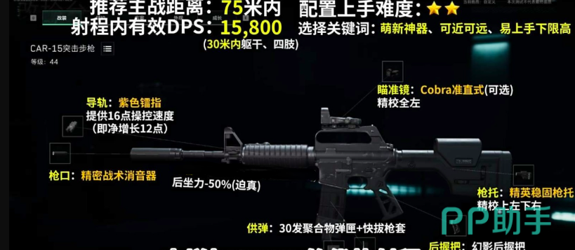 其实car15初始武器aks74u来看要更加好用一些,不仅非常的稳,而且还能够打出比较高的伤害值,对于萌新玩家来说,上手难度并不是特别高,目前主要适应的作战距离是75m范围之内。在射程当中有效的GPS是15800,30m的范畴之内,对于敌方的躯干和四肢有着比较好的攻击作用。搭配方案的话,小编将会从导轨,瞄准镜,枪口,枪托,弹夹和后握把这几方面和大家详细聊一聊。