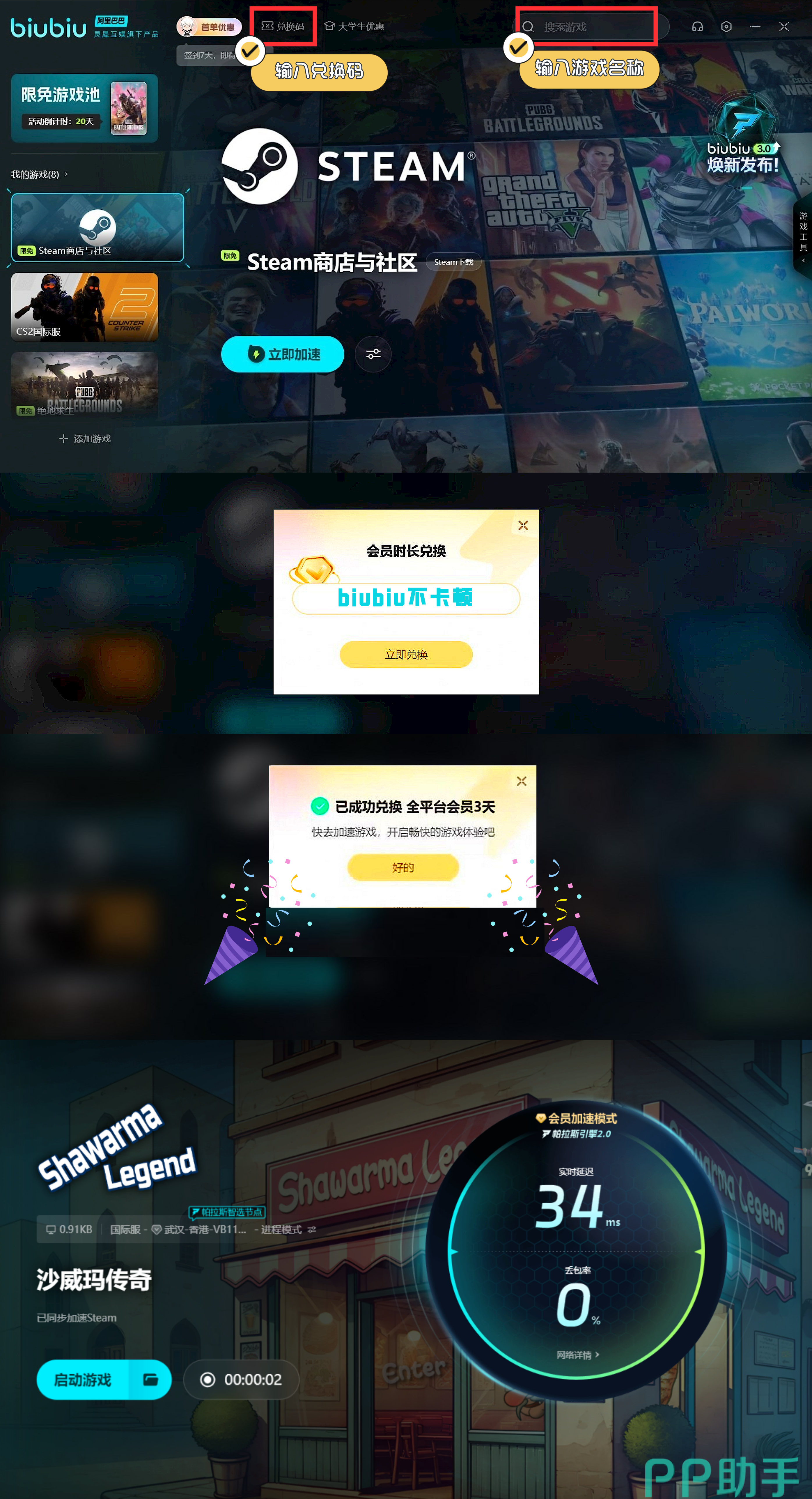 现在的新用户使用biubiu加速器好处也多,直接就可以领取免费的24小时加速时间,加上兑换码【biubiu不卡顿】也是新老用户都能拿去用的,加上72小时额外换取到的免费加速时间后,新人们可以用到96小时了。
