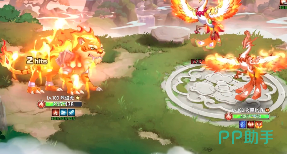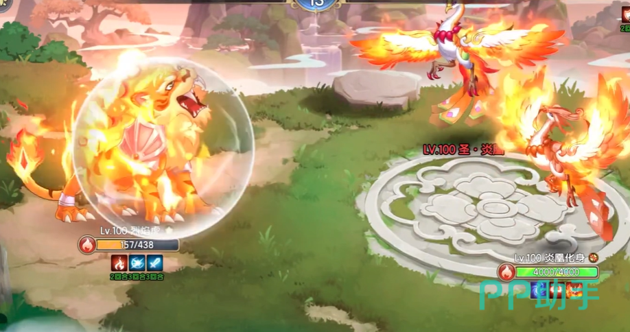 烈焰虎上场先使用净化减少自己的负面状态,然后再用火焰爪消耗对面的血量,大概一次可以造成1000多点伤害,这时候凤凰会召唤分身进行攻击,这时候玩家需要先用守住技能来抵消boss的致命攻击,大概守护二个回合,敌方的boss就会释放致命大招,躲过这个技能,释放大招终结掉敌方的本体就能轻松赢得胜利!