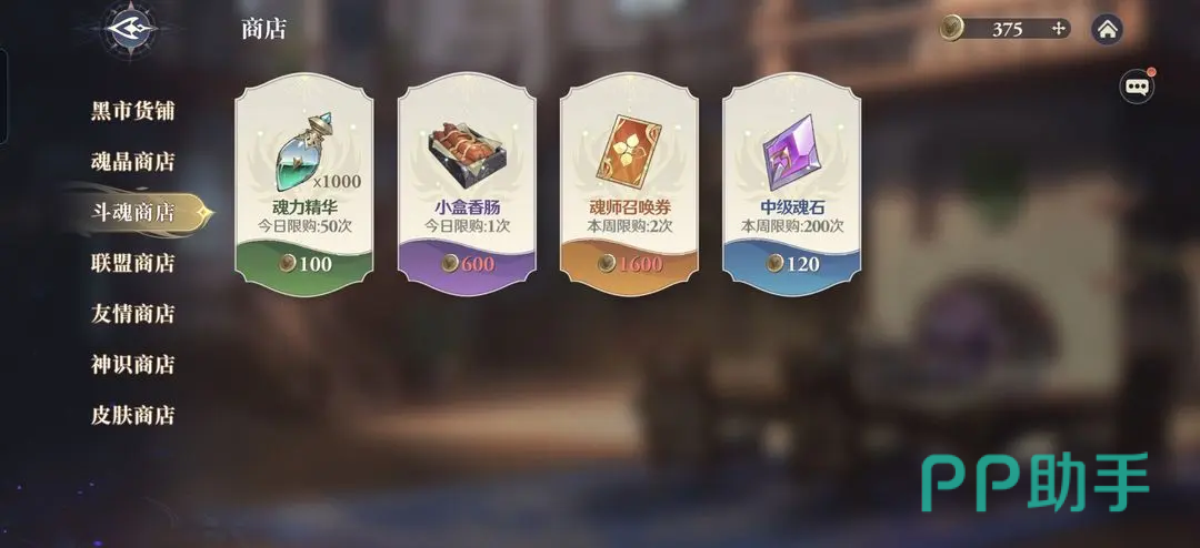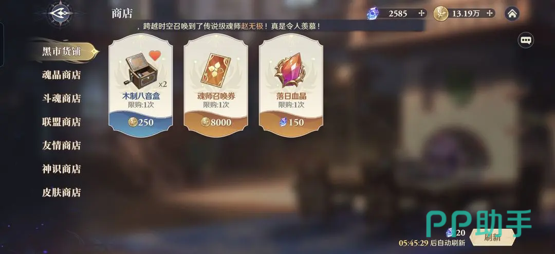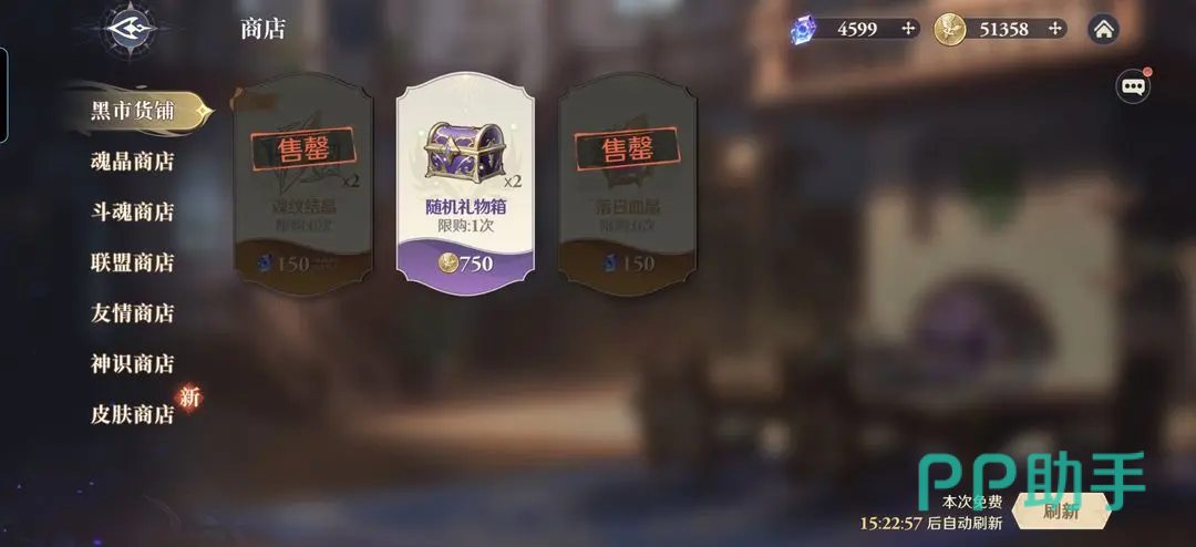 首先说黑市商店,这里面比较推荐买的有两种,一个是落日血晶,可以根据个人情况酌情购买,另一个魂师召唤券就是必买的道具了,黑市里面自然是有很多好东西,有些可以使用金魂币购买,有些需要使用魂晶,每天还有一次刷新的机会。