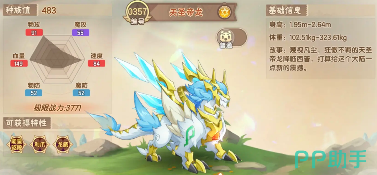 天圣帝龙可以通过手册来获得,比较适合微氪去使用。它的招牌技能是圣龙利爪,绝招是圣光龙啸,都拥有削弱有强化效果的对手的攻击力的作用。在生存能力上可以说是非常强大的。而且,他的输出也极为不凡,拥有高达91点的物攻种族值,实力强悍。