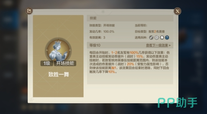 克里斯蒂娜的这一技能设计,显然非常适合那些依赖高输出核心英雄的队伍,如关羽等大核英雄,她的存在可以让这些英雄在战场上发挥出最大的威力,尤其是在快攻战术中,克里斯蒂娜能够迅速为队友提供强大的增益,帮助队伍在短时间内建立起优势,匹夫奋勇是物理队伍的神技,这个技能在战斗开始后的前3回合内,能够降低敌我双方全体造成的智力伤害15%,并且提升我军全体的攻击伤害30%,同时增加攻击距离1。