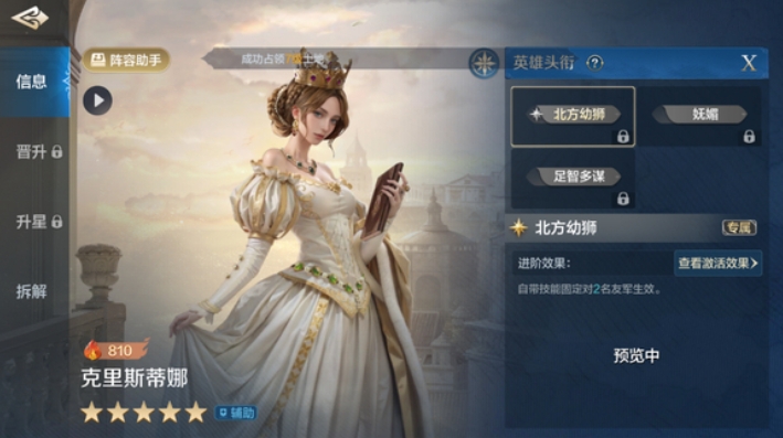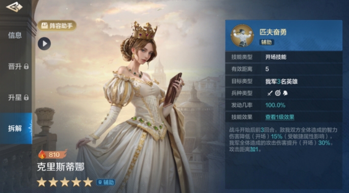 克里斯蒂娜在游戏中的定位是一个前锋角色,本身的技能设计巧妙地结合了增益与控制,每回合开始时,她都有100%的几率为1-2名友军施加以下效果,伤害类主动技能的发动率提升15%,并且在发动伤害类主动技能时,如果敌军统帅英雄在技能距离范围内,那么该技能本次造成的伤害将额外提升20%,这一提升效果受到智力属性的影响,这意味着克里斯蒂娜不仅能够增强队友的输出能力,还能在关键时刻通过提升伤害来改变战局。
