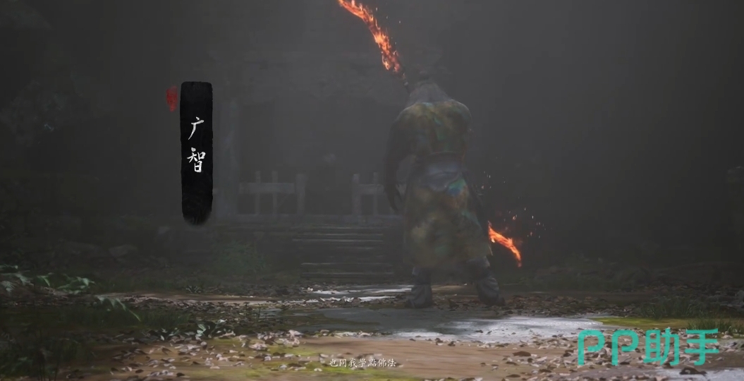 避开弓箭手射击后,可以用棍花抵挡它的后续射击,然后近身将其击杀,击杀完毕后过桥继续往前走,走完一定距离后可以看到一个大头石像,往那边过去就可以找到广智。