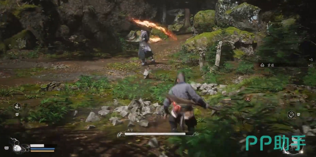 广智使用的是一把冒火的刀,对于部分害怕火焰攻击的怪物来说十分克制,击杀它之后你就可以变成它,然后用以后续的战斗,打败它的方法也很简单,定身术配合蓄力重棍击打,打完拉开躲避等CD再打下一套即可。