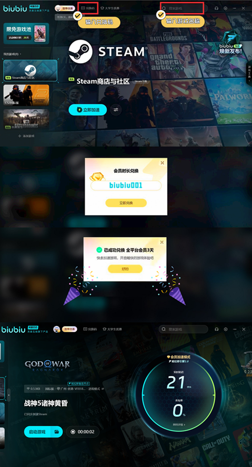战神5中,芙蕾雅的加入为游戏增添了新的战斗维度与情感深度。而游戏的联机玩法更是让你能跨平台进行联机对战。但是这对网速也有很高需求。这时大家完全可以试试biubiu极速器,而且现在活动不错输入兑换码【biubiu001】还能领取72小时的免费加速时间!而对于首次使用biubiu的新人玩家,更有额外惊喜——再赠24小时免费加速时间,这样就有96小时的免费加速时间了!
