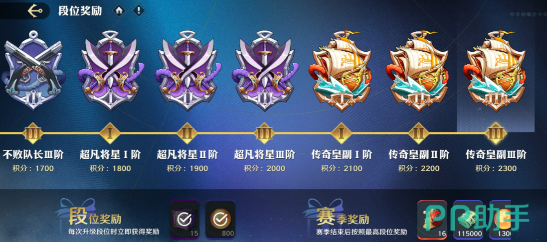 在排位赛季当中,玩家可根据积分获得不同的奖励,而在该游戏里段位分别包括普通海贼,中等海贼,精英海贼,不败队长,超凡将星,传奇皇副等八个不同的段位。而每个段位的积分也有所不同一个段位被分为三个阶,每升一阶积分就提升100。段位达到最高等级后可解锁赛季奖励,要想参排位赛,玩家需前往相对应的竞技场板块。