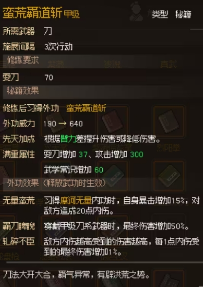 蛮荒鞘道斩则是喜欢用刀为武器的玩家最适合的一个外功,先天加成根据臂力的差异而有所变化,能够提升伤害或降低伤害,无量蛮荒是蛮荒鞘道斩中的一项强大技能,当习得摩河无量内功时,自身显击将增加15%,并且能够对敌方造成20点内伤。