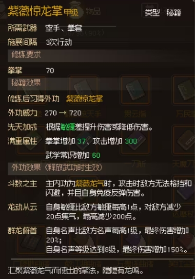 紫薇惊龙掌这门外功武学无需借助任何武器,只需空手或拳套即可施展,其先天加成更是根据敏捷的差异而有所变化,能够提升伤害或降低伤害,斗数之主是荒薇惊龙掌中的一项强大技能,当主内功为紫薇龙气时,攻击时敌方将无法格挡和闪避,并且自身免疫反弹伤害,这种设定让修炼者在战斗中能够更加轻松地击败敌人。