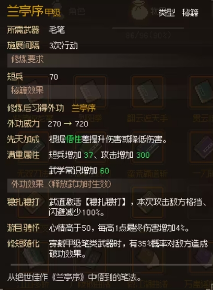 兰亭序是甲级外功,带来的先天加成更是根据悟性的差异而有所变化,能够提升伤害或降低伤害,满重属性短兵在这门武学的加持下,攻击力得到了极大的提升,不仅增加了37点的属性值,更使得攻击直接增加了300点,武学常识也增加了60点,稳扎稳打是兰亭序甲级外功中的一项强大技能,当武道激活这一技能时,本次攻击敌方格挡、闪避的几率将减少100%。