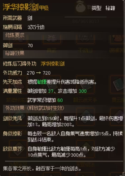 浮华掠影剑需要用到的则是剑,其满重属性短兵在这门武学的加持下,不仅属性增加了37点,更使得攻击直接增加了300点,武学常识也增加了60点,身似掠影是浮华掠影剑中的一项强大技能,当每击败一名敌人时,自身集气速度就会增加15点,并且这种效果会持续到战斗结束,同敌似草芥则是一项与敏捷紧密相连的技能,当自身敏捷比敌方敏捷每高1点时,对敌方减少10点集气,最高可减少300点。