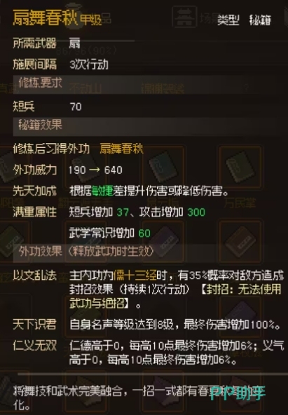 扇舞春秋也是一个甲级外功,这门武学所需的武器是一把轻盈飘逸的扇子,天下识君是扇舞春秋甲级外功中的一项强大技能,当主内功为儒十三经时,有35%的概率对敌方造成封招效果,同时自身名声等级达到8级时,最终伤害还会增加100%,仁义无双则是一项与仁德和义气紧密相连的技能,当仁德高于0时,每高出10点,最终伤害就会增加6%,当义气高于0时,每高出10点,最终伤害也会增加6%。