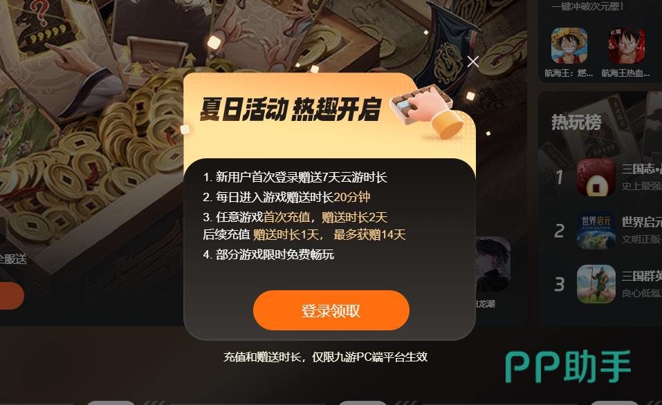 九游对于新注册的用户给到了七天的免费游戏时间,如果对某个游戏进行了首次充值,还会有2天免费时间赠送哦。每天都能进入游戏玩玩的话,更会多赠送20分钟的时长,而且还有限免游戏可体验,活动力度很大!
