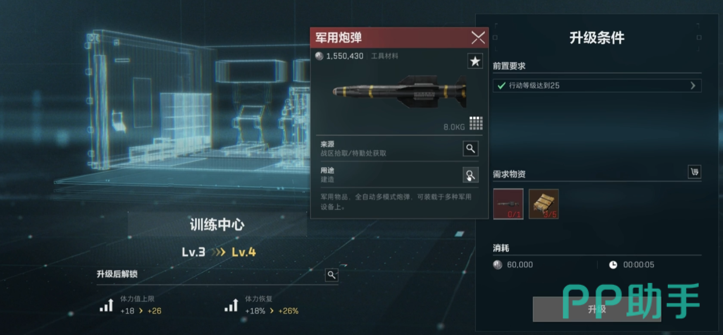 训练中心的升级首先需要玩家达到指定等级,每当达到一个新等级以后训练中心就会开放一次升级资格,从一开始的紫色和小金战利品到后面的军用炮弹等物资,玩家越往后升级训练中心需要的资源就越珍贵,粗略算下来要想把训练中心升到满级需要两千六百万哈夫币,所以在升级前大家最好准备好足够多的物资。