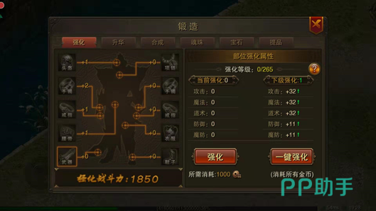 锻造强化主要提升头盔、项链等十个装备栏的属性,从零级开始强化,升至一级每个装备栏消耗一千金币,二级三千金币,越往后越困难;锻造升华消耗的是元宝,元宝可通过充值获得;而魂珠升级则通过刷副本得来的魂珠碎片进行升级,可大幅提升攻击力和防御力。