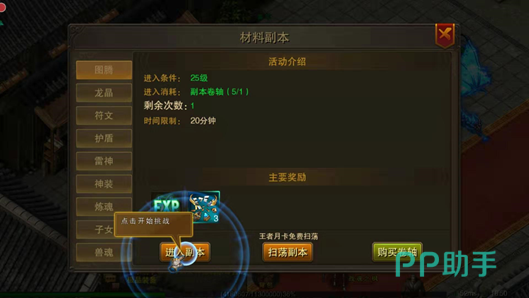 每进入一次副本消耗一个副本卷轴,主要奖励为经验以及各种碎片,图腾碎片可在神炉界面消耗精华提升图腾研究等级,龙晶碎片可提升龙晶等级,护盾碎片则提升护盾研究等级,极大地增强了人物的属性。