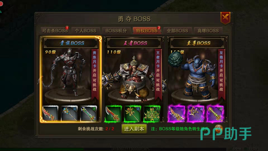 第三个是boss副本,每隔三十分钟或六十分钟刷一次,击败boss除了获得大量经验外,也是各种高品质武器掉落来源。Boss的种类个人boss、特权boss和高爆boss,个人boss要卷轴即可进入,特权boss要购买了月卡的玩家才有资格进入。