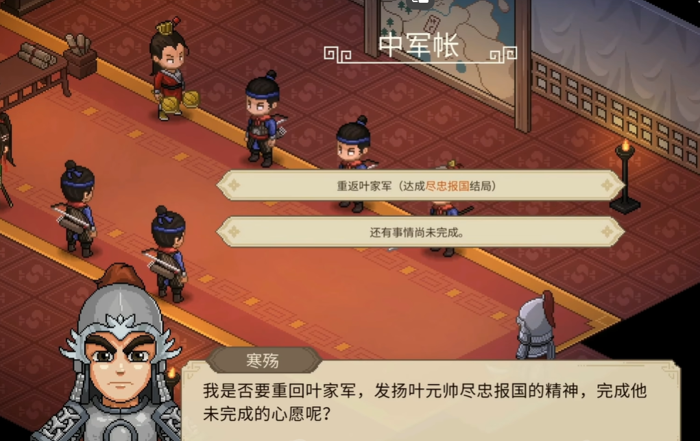 最后就是救出皇帝,由于主角以及叶元帅的牺牲会恢复叶家军的地位,之后回到叶家的帐篷的就可以获得精忠报国的称号,也算是圆了叶元帅的心意。