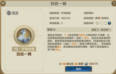 技能机制:克里斯蒂娜的技能能够在每回合开始时,为1-2名友军提供效果,包括提升主动伤害类技能的发动率15%和伤害20%(如果敌军统帅英雄在技能距离范围内)。这个效果在回合结束时清除,并且下回合的触发几率会下降10%。这个机制使得克里斯蒂娜在战斗中能够持续为队伍提供支持,尤其是在对抗具有统帅英雄的敌人时,她的技能能够显著提升友军技能的威力和效果。