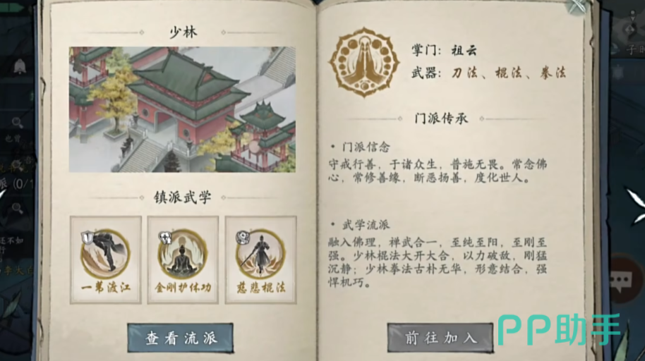 其次武当门派的阵法流也是非常推荐给各位新手玩家的,这一套流派是以剑和拳为主要的武学,可以为玩家的队伍带来永久的增益效果,并且还能对敌人造成内功伤害,可以选择武当绵阵、催心掌和八卦剑阵。