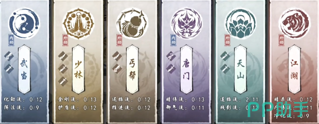 首先在游戏中一共是有六大职业门派可以选择的,每一个门派下面还会有两种不同的流派,在游戏中的战斗玩法就主要是围绕着这十二种流派所展开的,大家在下图中可以详细的看到。