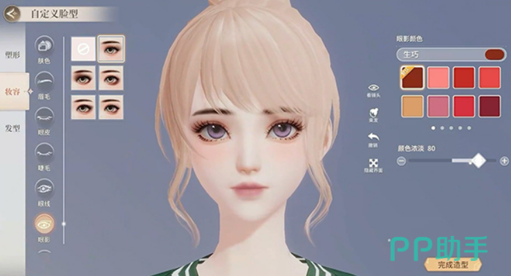 完成五官的设定后,就要开始精雕细琢妆容部分。妆容环节不仅仅是简单的颜色选择,还包括微调浓度和细节,如眼影的色调、眉形的弧度、腮红的位置以及口红的饱和度等。通过这些精细调整,你可以使角色更加生动有特色。