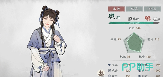 璇玑是一个单体攻击角色,在众多队伍当中都可担任输出角色,拥有较强的攻击伤害能力,无论内功心法还是外功技能都能造成较高的伤害,该角色攻击为1220护体为796,也有较高的气血为12821,该角色可在众多队伍当中担任主c位置,攻击敌人时命中几率也很高为158。